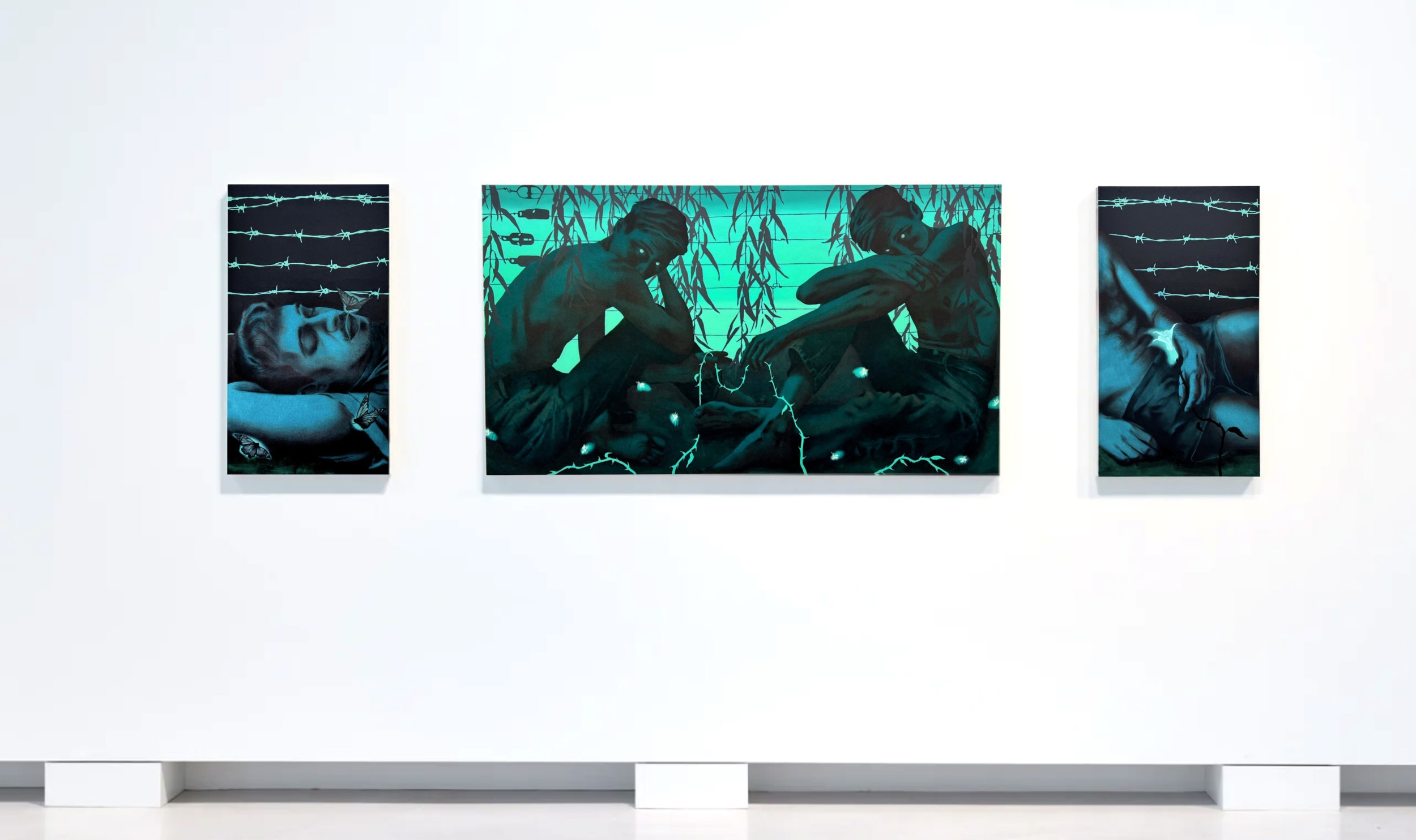 David Weishaar is a painter born in 1987 in Hagueneau (fr) who lives and works in Lausanne, Switzerland. He graduated from the University of Strasbourg (2009) and the ECAL–Ecole Cantonale d’Arts et de Design de Lausanne (2013). Favouring the portrait genre as his main means of expression, David Weishaar chooses his models from among people with whom he has a strong relationship, either of friendship or of admiration for their activism or commitment. In short, it is a matter of group, of entourage, of chosen family. So he takes his characters into nocturnal worlds referenced from fantasy, mainstream, vampire or witch stories. These dreamlike and symbolic environments are conducive to the exploration of bodies, genders and desires. Through his pictorial work, David Weishaar attempts to deconstruct and make visible the relationship to plural identities. His work has already been shown in numerous exhibitions abroad, in galleries and institutions, including “Peintres, Une exploration de la peinture contemporaine in French-speaking Switzerland” at the Centre d’Art Contemporain, Yverdon-les-Bains (Switzerland, 2023). In autumn 2022, David Weishaar was featured on the cover of “T”, Le Temps magazine, which devoted a portfolio to him. In March 2023, David Weishaar presented his first solo show in France at DS Galerie, “La griffe leur apporta une fleur” and had a solo exhibition at Material fair in Mexico City in 2024 with DS Galerie.