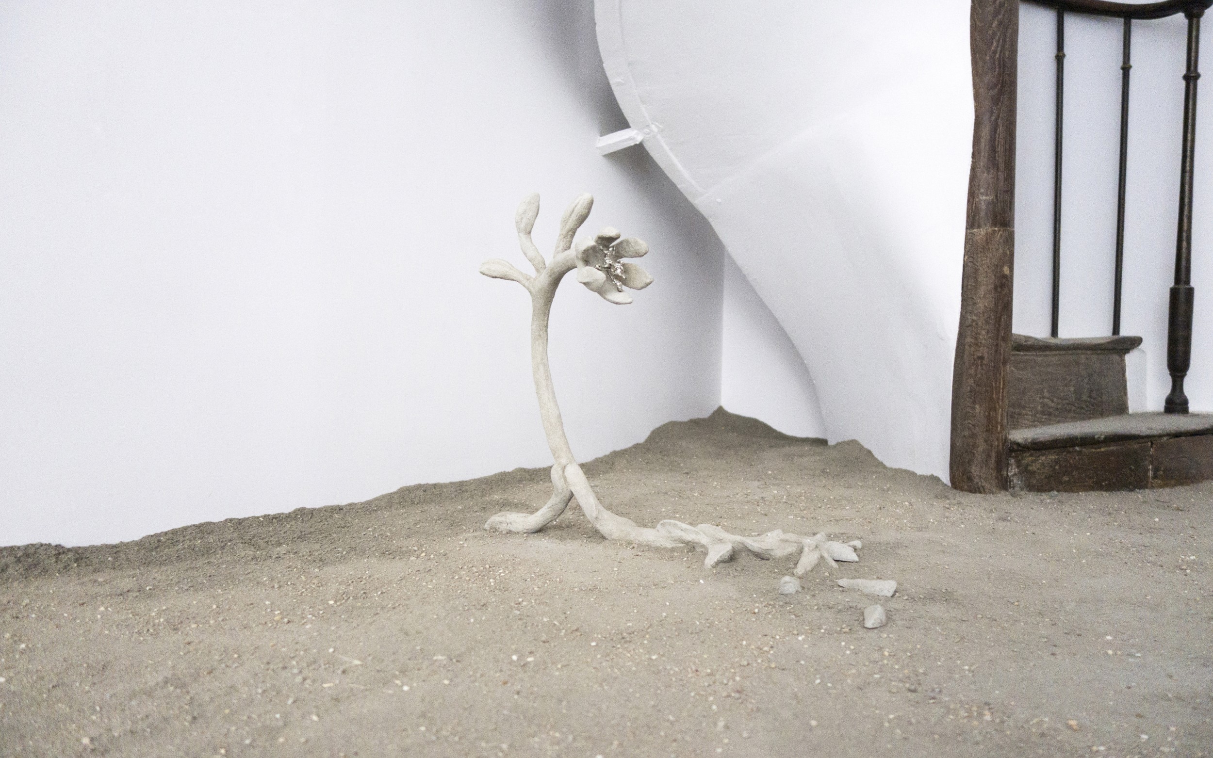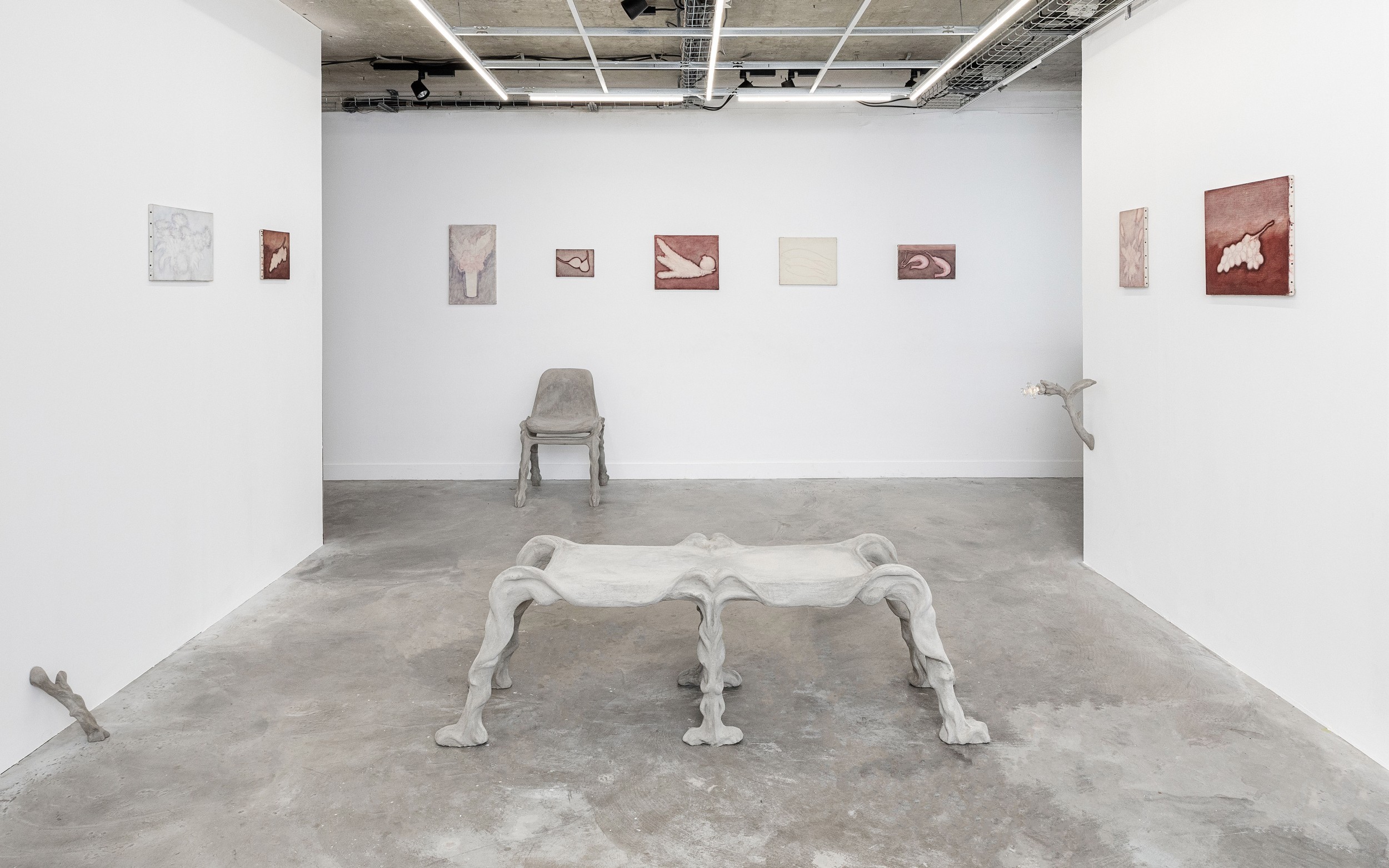 The Xolo Cuintle duo create petrified, deserted scenes using concrete as a geological component emblematic of the challenges of our contemporary era. This favourite material, seemingly unchanging and inert, is sculpted like fertile soil in which hybrid organisms flourish. Using ornamentation as a temporal marker, each of their sculptures becomes part of a shared history, blurring the linear concept of time. Speculative in nature, blending contemporary news and ancient mythologies, their narratives explore a history of soils and the life forms that make them up.