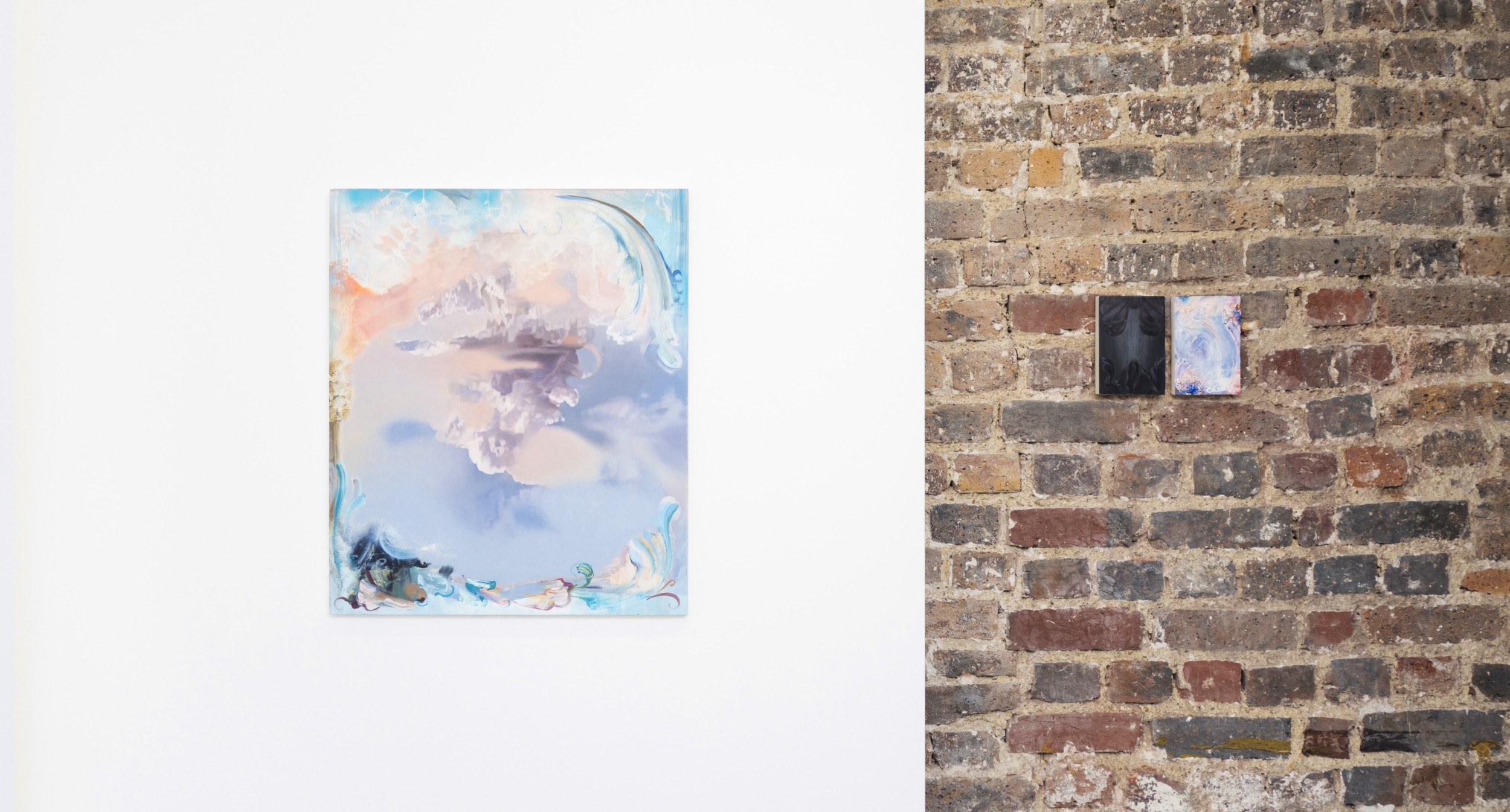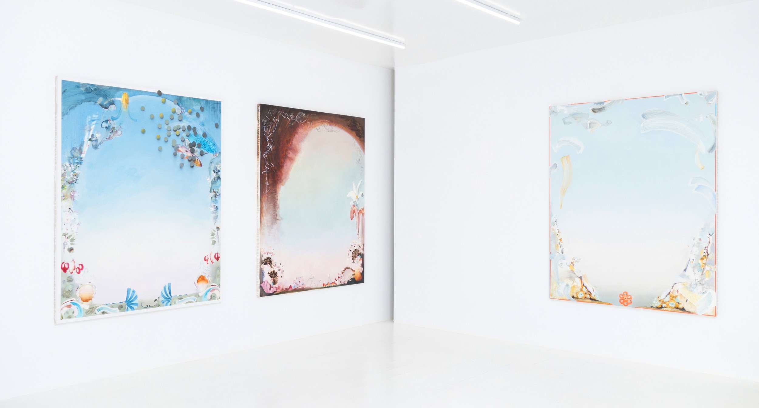 The question of movement in Marijke Vasey’s paintings is already apparent in her working methods. Indeed, the artist, steeped in iconographic references ranging from François Boucher (1703-1770) to Tomma Abts (1967-), first works with collage, whether physical and/or digital. It is from this preparatory work that she modifies and articulates her compositions. Her compositions took a decisive turn in 2019 when the artist decided to focus specifically on the edges of her canvases, pushing all figurative images and motifs to their limits and recreating a frame. This process allows her to create liminal and decorative areas on a surface whose centre is supposed to contain the image, the main message of the painting. In Marijke Vasey’s work, the centre is above all empty space, but coloured empty space, a surface that oscillates between colourfield painting and sketches of skies in the style of William Turner (1775-1851).