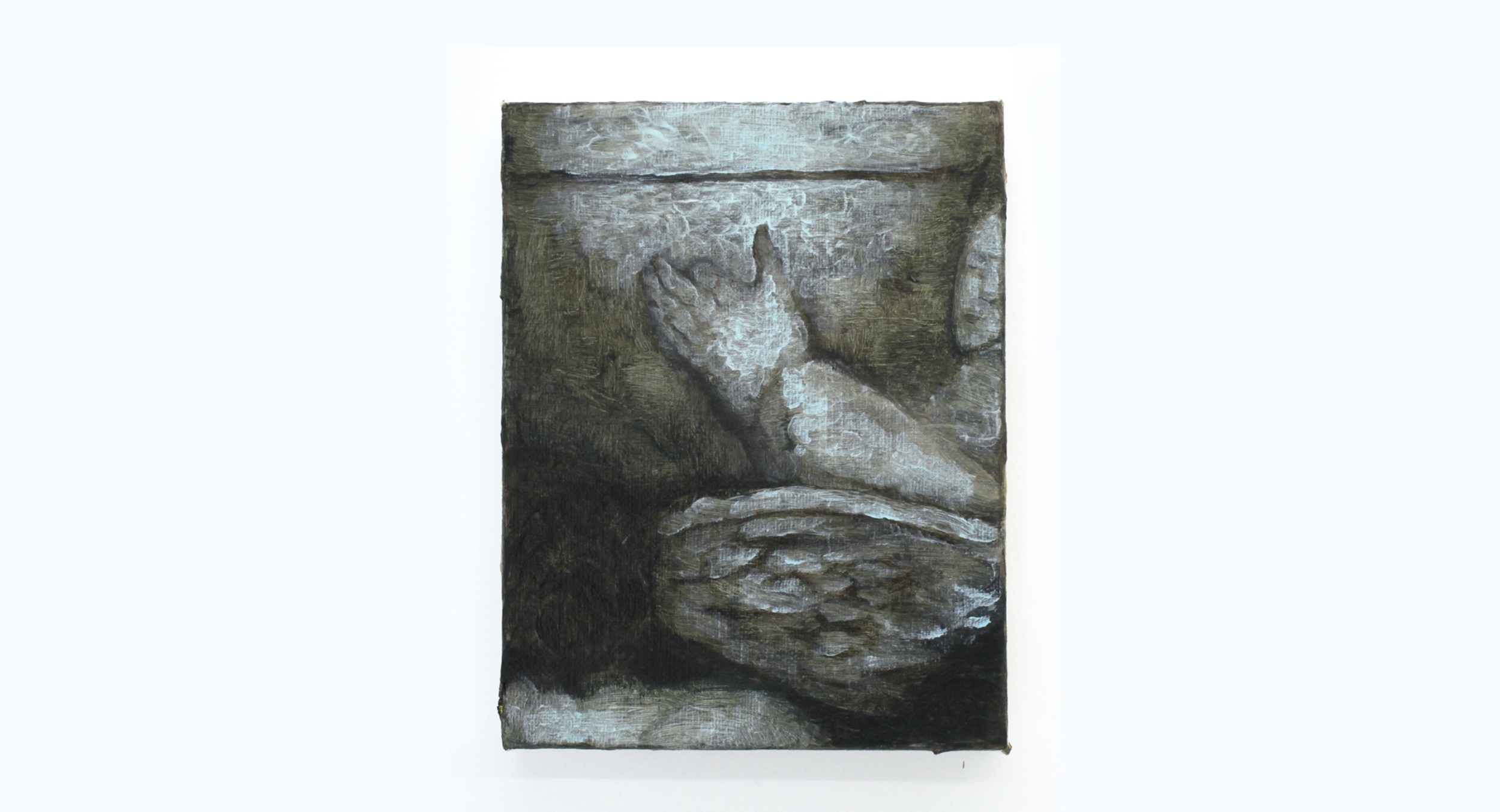 On the walls unfold a reduced selection of tableaux, almost tableautins for some, catching the eye with their uncertainty chairing on their surface. Shapes coming from an accumulation of touches with variable opacity, from thin layers to others giving an impression of rugosity. A feeling of déjà-vu emerges, taking us back to a domestic universe fallen in decay and nonetheless fascinating. Bathed in twilight, scenes, of unknown temporality, are adorned with mixed shades, almost voluntarily dirty, oscillating between green and brown, between grey-blues and purples. Alternating between diaphanous and contrasted colours, we can distinguish a dog, a horse-like statuette, some flowers, masks of faces made of an uncertain material, or even a cherub in his eternal slumber.