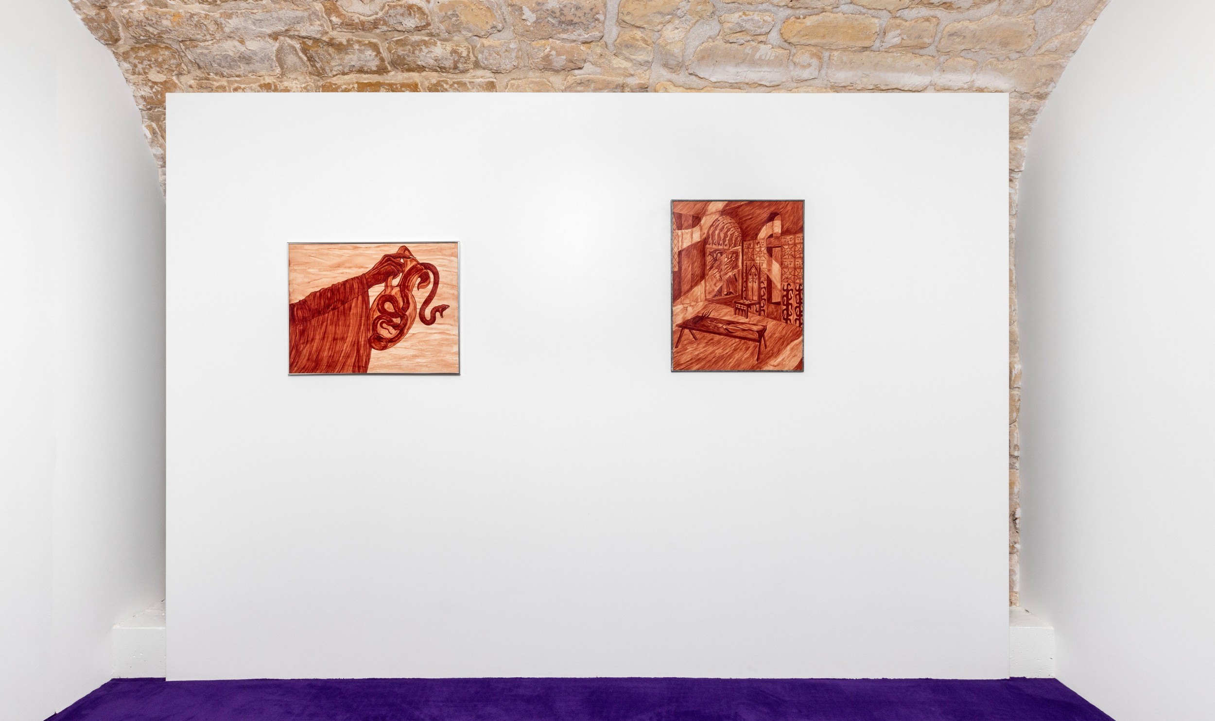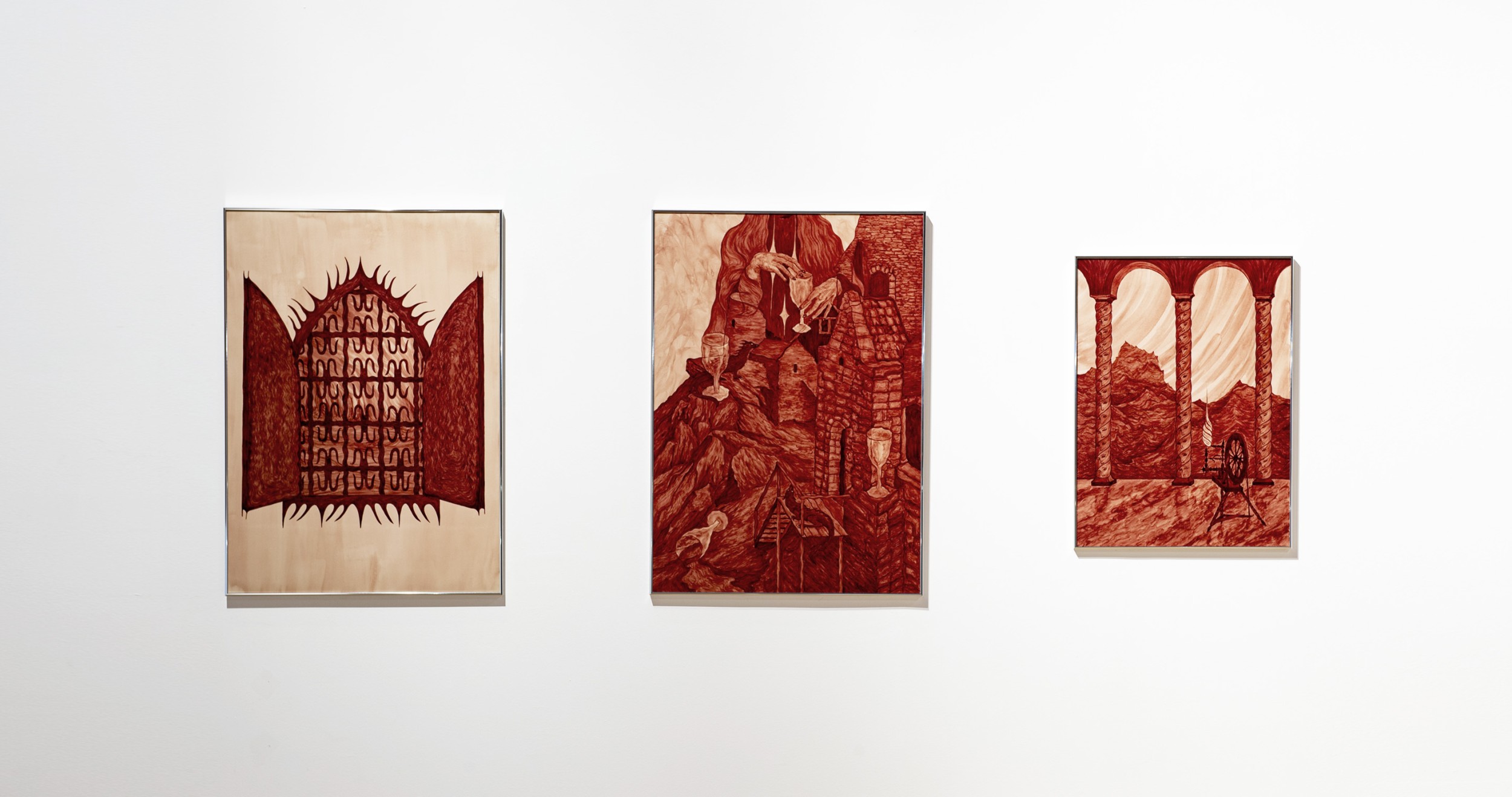 Depuis bientôt dix ans, Alison Flora (née en 1992) utilise dessin et peinture, mais aussi sculpture, musique et vidéo pour exhumer la part obscure du monde et ouvrir des portails vers une autre réalité, aussi sombre que salvatrice. Ses œuvres sur papier peintes avec son propre sang, technique qui a fait sa notoriété depuis 2019, se font l’incarnation la plus explicite de cette connexion viscérale avec les limbes de l’âme et les énigmes insolubles du subconscient, qu’elle explore également à travers la musique, la sculpture ou encore sa pratique de VJ (vidéo-jockey). Imprégné par les folklores régionaux et sciences occultes, par l’architectures médiévale et la littérature gothique, mais aussi toute une culture souterraine – métal, rock industriel, raves –, le travail de la jeune femme traduit les affres et les espoirs, les rêves comme les cauchemars d’une génération perdue dans les tourments de son époque dont elle chercherait à s’échapper. L’artiste française a notamment exposé au Salon de Montrouge et aux Abattoirs de Toulouse (2022), au MO.CO. à Montpellier et au Pavillon Southway à Marseille (2023). Depuis, ses pièces ont intégré les collections du MAC VAL et du FRAC Occitanie. Elle présentera son premier solo show à la DS Galerie à l’automne 2024.