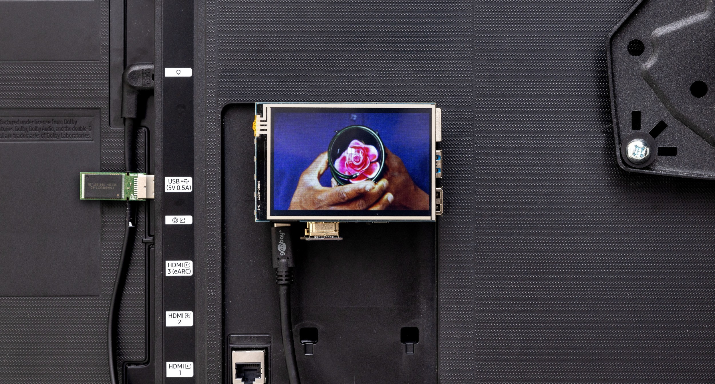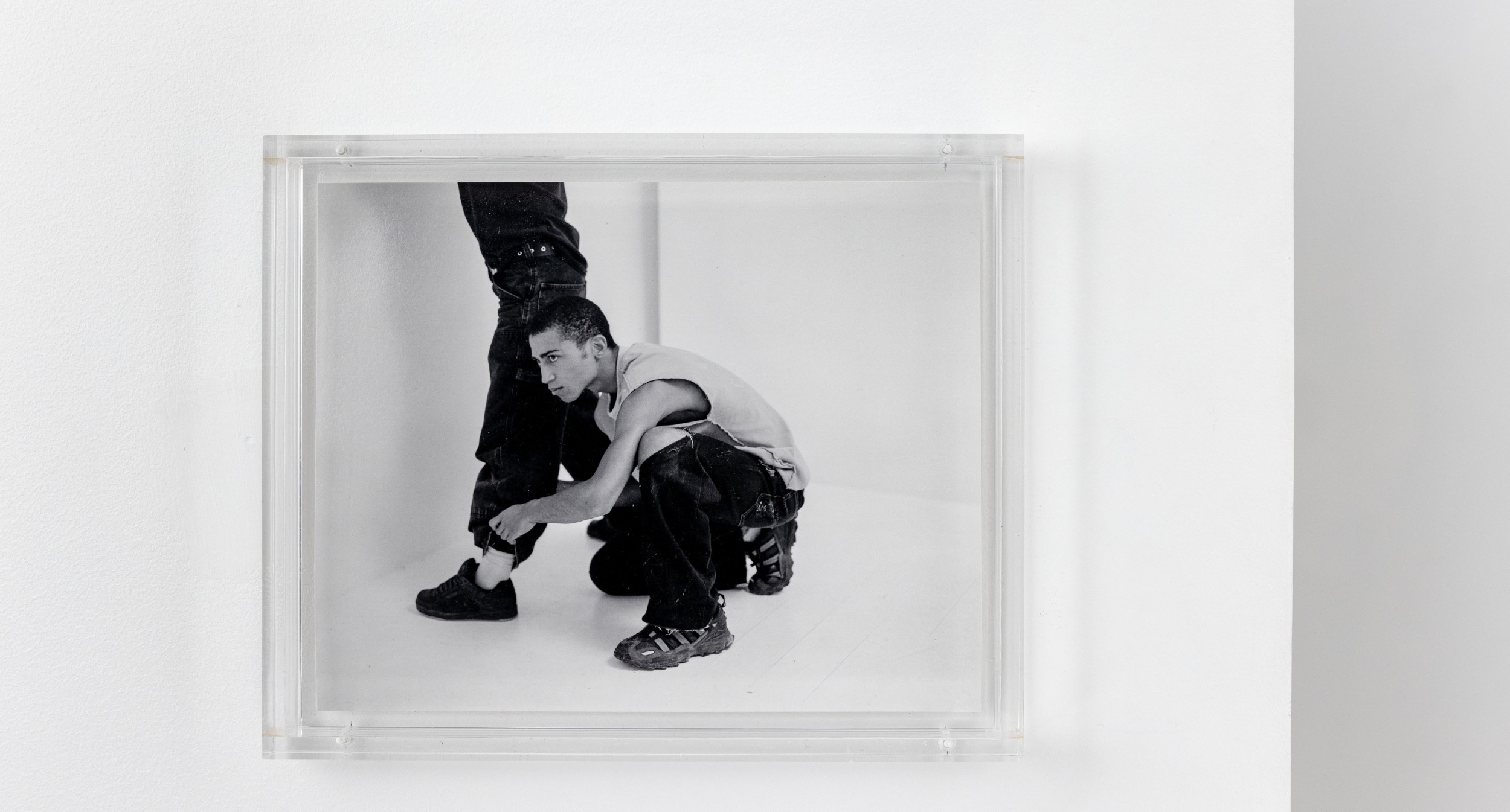 “Grammars”: une exposition personnelle d’Andrés Barón. Sur deux écrans sont présentés le film Grammars issu d’une collaboration avec lae musicien·ne Dreamcrusher en 2021, et Fresco (tres veces), réalisé en 2022. Les écrans sont disposés sur une fine île synthétique de racines-câbles, végétation-écran sur pilotis-praticables. Dévoilant leurs envers à celleux qui pénètrent dans l’espace, les écrans apparaissent comme parasités par des écrans plus petits qui diffusent en boucle des fragments d’action, des sortes de scènes achevées. S’ils se montrent comme des boucles fermées, le dispositif apparent de câbles et d’accroches évoque plutôt un système ouvert, qui permettrait des échanges continus de matière et d’énergie avec l’écosystème de l’exposition. Ils rappellent aussi les moniteurs de contrôle ou les tableaux de bord : des interfaces visuelles qui offriraient des séquences dynamiques d’autres environnements. Des sortes de périphériques d’information à la surveillance douce, qui s’intéresserait davantage à l’image et la composition du milieu surveillé qu’à son contenu. Gravitant à la périphérie de l’île et formant son arrière-plan, sont accrochées des photographies qui se répètent parfois, prises au sein de l’espace d’exposition. À travers ce jeu de doublage, de récurrence, de mise en abyme, et de parasitage, un visage revient de manière persistante.