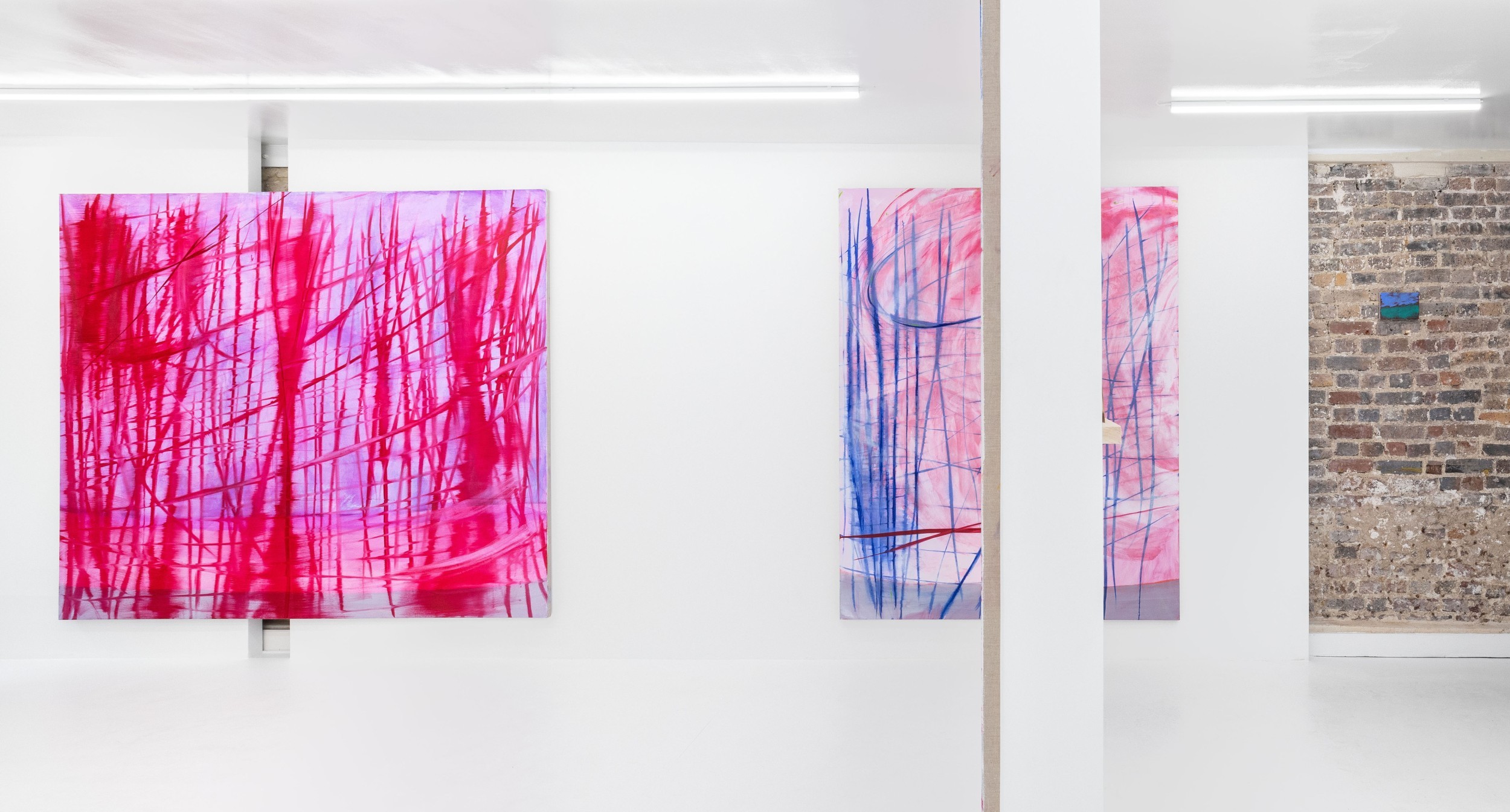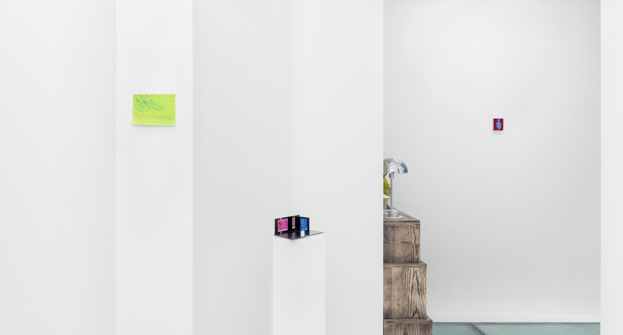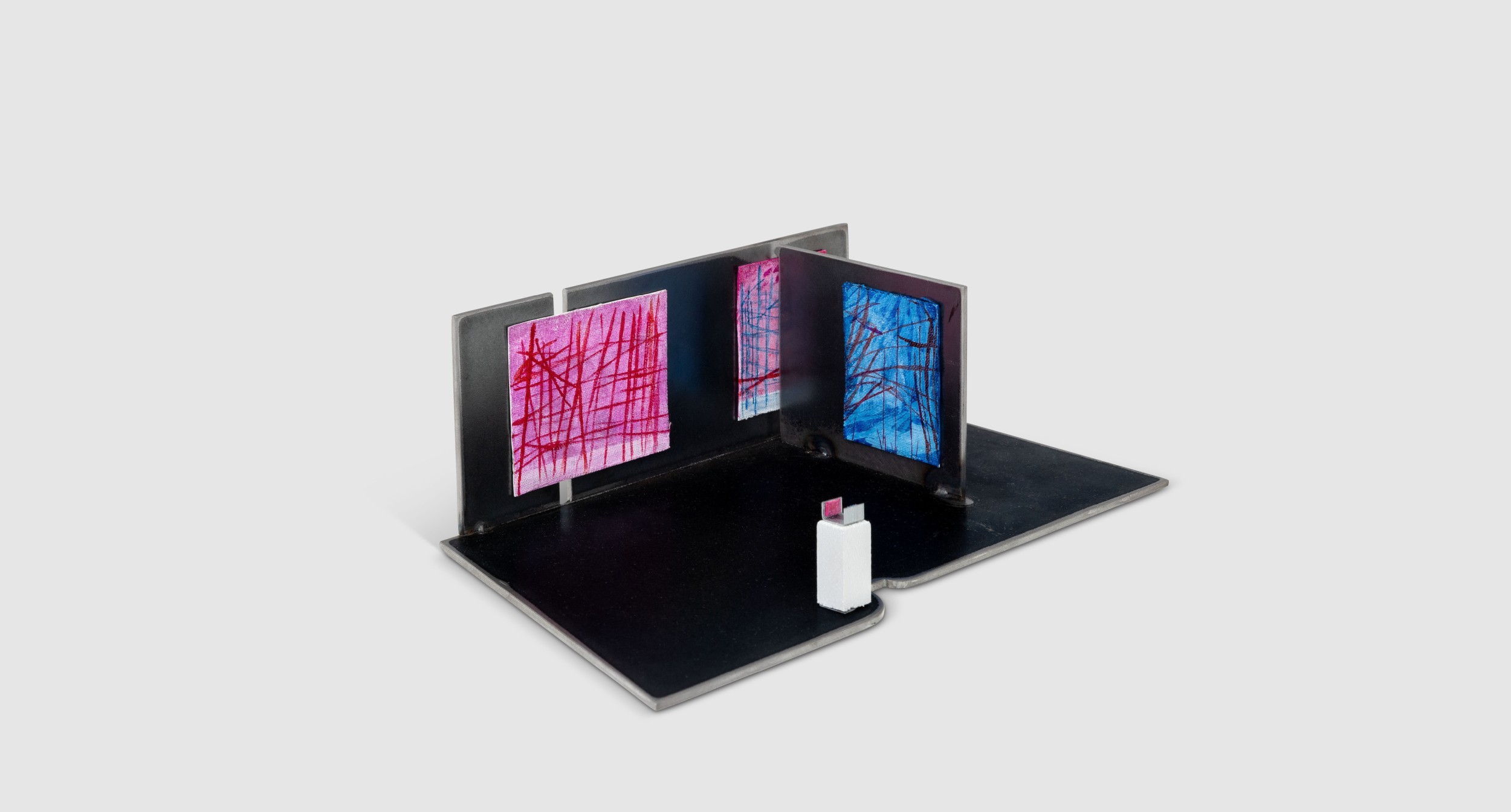 Dans cette installation aux forts contrastes quelques petits objets résonnent énigmatiquement. La petite colombe, huile sur jean (d’enfance), dont l’artiste s’entoure comme si c’était un totem pendant ses intenses interactions avec les toiles et qui veille sur l’exposition, comme un œil protecteur pour elle face à l’intensité de ses expressions. Il y a aussi une trace de son atelier qui donne une note de vert inattendue et unit l’intensité des roses : un post-it avec un dessin automatique qu’elle a réalisé lors d’un appel téléphonique, avant de commencer à travailler sur l’exposition et une mise en abyme qui nous projette dans un espace “meta” où une maquette minuscule nous révèle une nouvelle histoire de l’exposition.