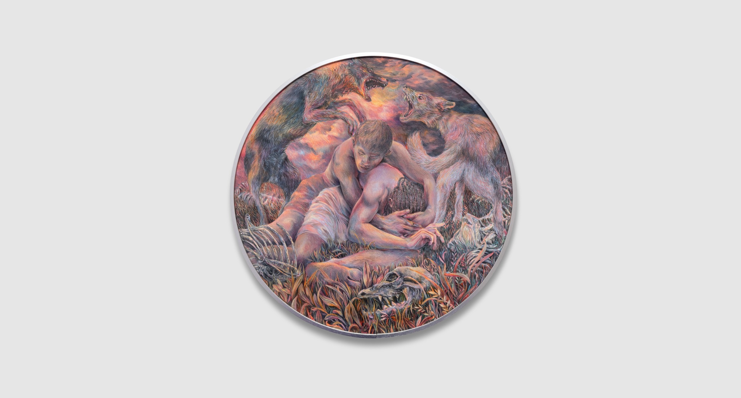 Crayon de couleur sur papier, encadrement aluminium, 50 cm de diamètre.